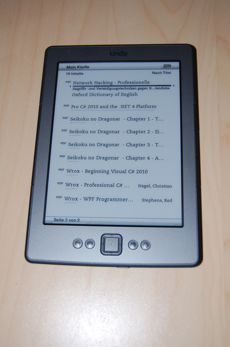 Nachdem ich den Kindle nun seit fast 2 Monaten in der Hand halte, traue ich mir zu, ein Fazit zu schreiben. Zuerst ein Kommentar zum Display: Das gefällt sehr gut, es liest sich wie in einem Buch, das Schriftbild wirkt scharf. Auch liegt das Gerät gut in der Hand, es ist klein genug, um es überall mitzunehmen und es ist sogar leichter als die meisten Bücher. Die CPU bewältigt alle Aufgaben schnell, je nach Größe des Dokuments dauert das Öffnen maximal 2 Sekunden, Umblättern dauert im Durschschnitt eine Sekunde. Den Amazon-Store habe ich nicht angetestet, weil ich eher PDFs ohne DRM aus anderen Shops lese, da man PDFs bekanntlich auf jedem Gerät öffnen kann. Sogar einen Webbrowser hat das Kindle, aber weil das Browsen ohne Tastatur und nur in Schwarzweiß nicht sonderlich Spaß macht, greift man sehr schnell wieder zum iPhone ;) .